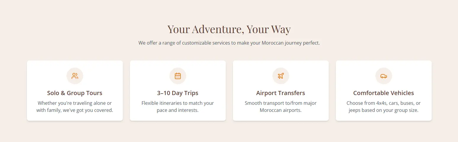 Your dreams, your pace, your Morocco. We craft custom itineraries that perfectly balance iconic landmarks with off-the-beaten-path discoveries.